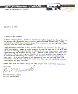 September 6, 1991To Whom It May Concern: As mayor of Springfield, I wish to express my highest regard for Casey Dale and his enterprise; Dangerous Sports Club of America/Bungee Masters Inc. Casey performed around 20 demonstration jumps from a crane at the Springfield Filbert Festival over the Labor Day weekend. I was personally involved in four of his jumps as his assistant in the cage at a 100-foot height. Casey is truly a master at what he does and I, as a 60-year-old male am willing to put my life in his hands at some future date. As a very close observer and as Mayor of our City, I want to be certain that this was a safe sport. Casey went to great lengths to not only explain, but ask me to be involved in everything but jumping. His insurance would not allow it at that event. I am so confident in his mastery of this and related high risk activities, that I plan to jumper at least once this year and hopefully several times before our next festival. Sincerely, Bill Morrisette, Mayor City of Springfield
