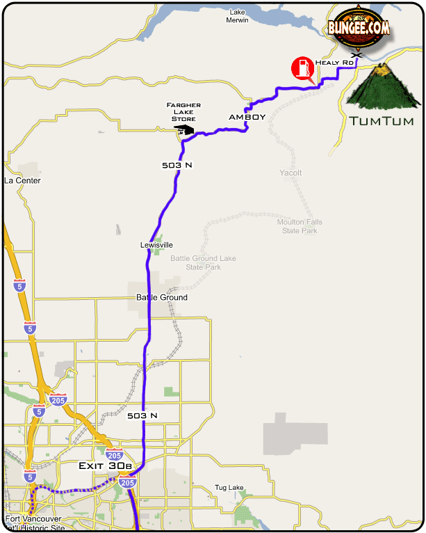 Bungee Bridge AddressUse this address for Googling or to find us using your car's GPS: NE Healy Rd. and NE Belvins Rd.Amboy, WA 98601 Directions to Bungee Bridge from PortlandApproximate drive time: 1 Hours Here is how you get there.... (1) Follow I-205 North cross the Columbia River into Washington. (2) Take exit #30B (Hwy 500 East). Then immediately head north on Hwy 503 toward Battleground, WA. (Do not turn into Battleground) (3) Continue north past Battleground for 12 miles to Amboy. (4) As you drive through Amboy you will see a State of Washington Hwy sign next to the school, the sign reads Cougar North 503. Turn right onto Chelatchie Rd. (5) Follow the 503 Highway signs. Approximately 4 miles from the sign in Amboy you will come to a Gas Station (Chelatchie Prairie Store & Gas). (6) Turn right at the Chelatchie Prairie Store (gas station) onto NE Healy Rd. Please do not go into Northwest Pulp and Paper Equipment that is off NE Healy Rd. on NE 424th. (7) Follow NE Healy Rd toward Tum Tum Mt. for approximately 2.2 to 2.3 miles. Keep track of your miles if you go 3 miles you went too far! (8) At the base of Tum Tum Mt. (Clear-cut pyramid shaped butte on your right). Look for a post and gate on the left-hand side of the road topped with an orange highway cone. (Small "Bungee Only Parking" is written on two small signs at the gate into the parking lot). Turn left at the crosswalk, NOT right on NE Belvins Road. (9) Also on your left you will see our big black gate, our bridge is 1/4 mile down the road from the gate. The right side of gate will be unlocked during our jumps for you to walk through (No Cars) (10) Park your vehicle in the Bungee Parking lot to the right of the gate. You will have about a five minute walk down our private paved road to the bungee bridge. (11) ZiplineX flyers, you will need to remain in the parking lot and your guides will meet you in the parking lot. *Remember to BRING CASH ONLY No checks or cards on site! |