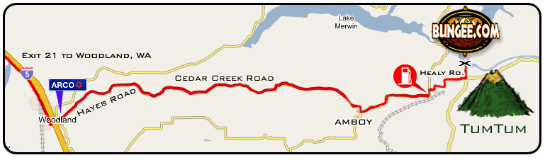 Bungee Bridge AddressUse this address for Googling or to find us using your car's GPS: NE Healy Rd. and NE Belvins Rd. Amboy, WA 98601Directions to Bungee Bridge from SeattleApproximate drive time: 3 Hours Here is how you get there.... (1) From Seattle take I-5 South to exit # 21 (Woodland, WA). (2) The road will parallel the freeway south for approximately 1/4 to 1/2 mile (this is Pacific Ave). (3) As you approach the first light, turn left (east) at the light crossing under I-5 and crossing Atlantic Ave. (4) Important: After having crossed under the freeway, take your first (legal) right onto CC Street (before the ARCO station). (5) You will immediately cross a bridge over the Lewis River, bear left coming off the bridge onto Hayes Road and follow the road (this road will become Cedar Creek Road just a few miles out of Woodland) toward Amboy, WA (approximately 15 miles). (6) DO NOT turn into Amboy (on NE 221st & Cedar Creek Rd.) but continue on road toward Chelatchie Prairie Store & Gas (approximately 3.5 to 4 miles past the turn for Amboy). (7) Turn right at the Chelatchie Prairie Store (gas station) onto NE Healy Rd. Please do not go into Northwest Pulp and Paper Equipment that is off NE Healy Rd. on NE 424th. (8) Follow NE Healy Rd toward Tum Tum Mt. for approximately 2.2 to 2.3 miles. Keep track of your miles if you go 3 miles you went too far! (9) At the base of Tum Tum Mt. (Clear-cut pyramid shaped butte on your right). Look for a post and gate on the left-hand side of the road topped with an orange highway cone. (Small "Bungee Only Parking" is written on two small signs at the gate into the parking lot). Turn left at the crosswalk, NOT right on NE Belvins Road. (10) Also on your left you will see our big black gate, our bridge is 1/4 mile down the road from the gate. The right side of gate will be unlocked during our jumps for you to walk through (No Cars) (11) Park your vehicle in the Bungee Parking lot to the right of the gate. You will have about a five minute walk down our private paved road to the bungee bridge. (12) ZiplineX flyers, you will need to remain in the parking lot and your guides will meet you in the parking lot. *Remember to BRING CASH ONLY No checks or cards on site! |